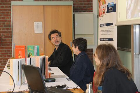 Après une présentation de la maison d'édition L'École des loisirs et de ses nombreuses ressources pédagogiques, Olivier Tallec s'est arrêté sur son parcours, son processus de création, ses inspirations, et nous a même fait le plaisir d'offrir une lecture en avant-première de ses deux prochains albums : En attendant les barbares (à paraître ce mois-ci) et Il paraît que... (à paraître en avril 2026) !