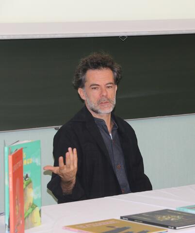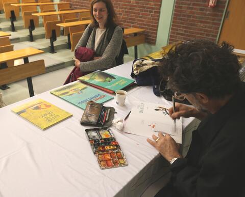 Après des échanges avec les étudiant(e)s, Olivier Tallec s'est enfin prêté au jeu des autographes, démontrant ses talents d'illustrateur en direct !